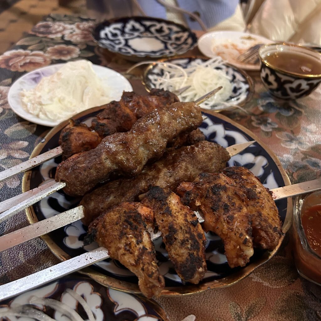 Shokhrukh Nur comprises the essence of local dining in Uzbekistan! Shashlik, bread and tea with the usual awesome Uzbek hospitality. The chicken shashliks was amazing! The homemade salsa and yogurt make amazing bread dips.